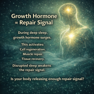 Deep sleep supports the release of growth hormone and other repair-related signals. Chronic sleep deprivation has been associated with impaired tissue repair mechanisms.⁶
